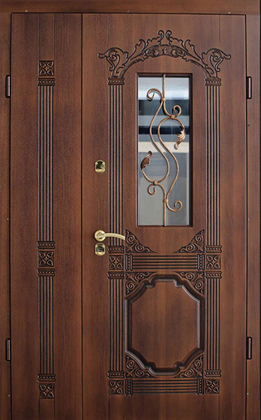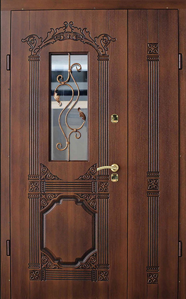 Уличная двухстворчатая дверь со стеклом и кованой решеткой №26 — это не только надежная защита для вашего дома, но и элемент, который подчеркнет его стиль и индивидуальность. Внешняя отделка из МДФ с ПВХ обеспечивает долговечность, устойчивость к внешним воздействиям и сохранение эстетического вида на долгое время. Добавление кованой решетки и стеклопакета придает двери элегантности, а также улучшает светопропускание, создавая комфортное освещение в вашем помещении. Уличная двухстворчатая дверь со стеклом и кованой решеткой №26 от производителя: быстрое изготовление и монтаж в Михнево, индивидуальные размеры, широкий выбор материалов и фурнитуры, официальная гарантия до 10 лет.